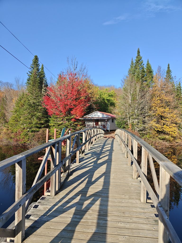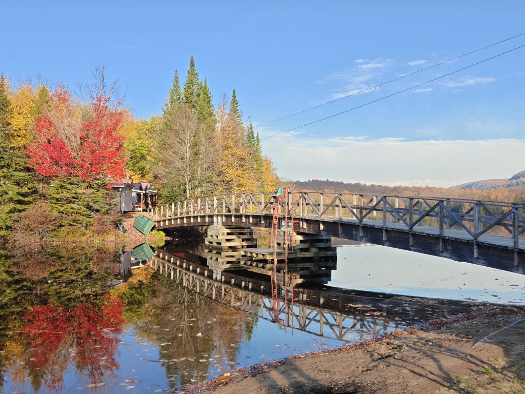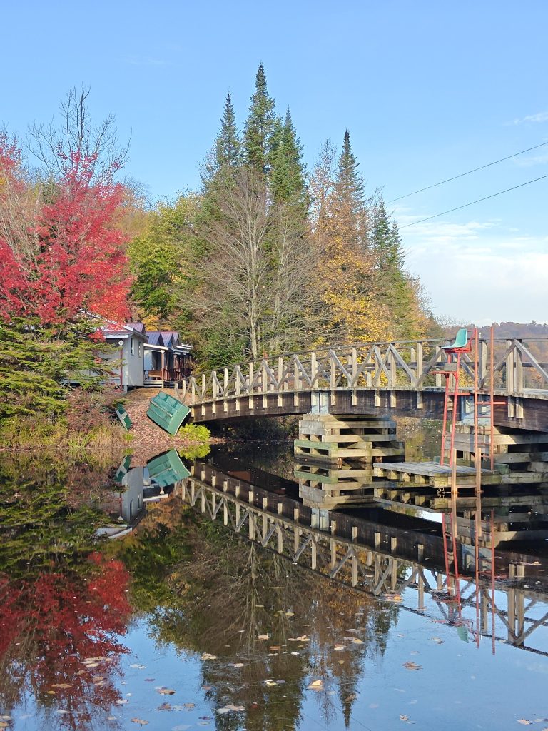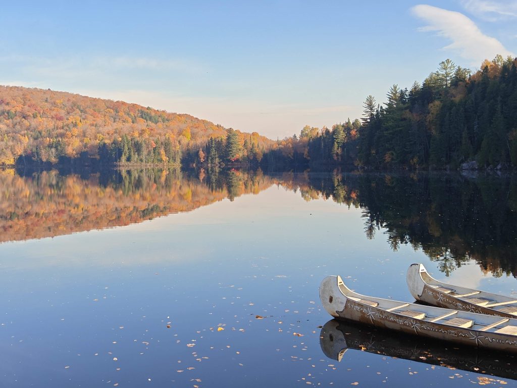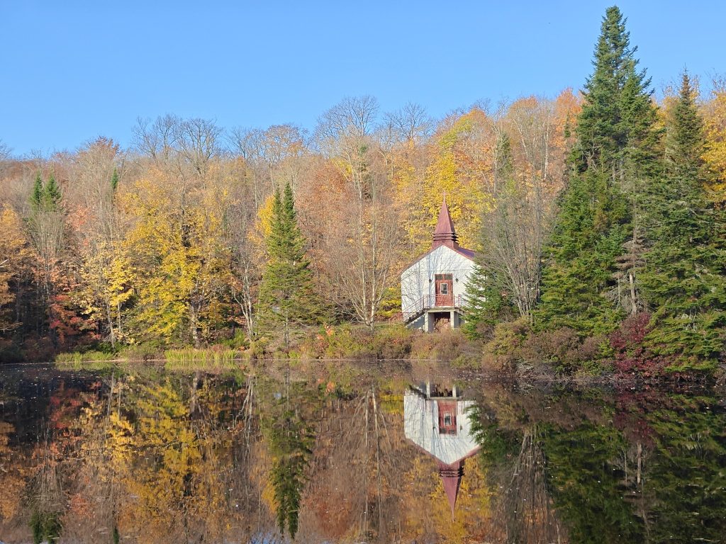 Je découvre des maisons blanches aux toits rouges, couleurs typiques des érablières. Le sol est recouvert de feuilles fraîchement tombées et légèrement luisantes sous la rosée. Je descends vers le lac où je découvre une eau calme reflétant tel un miroir la forêt au-delà.