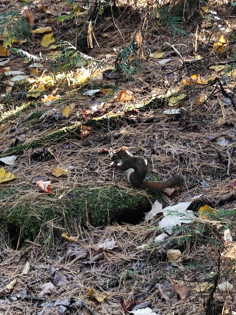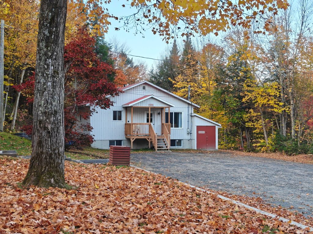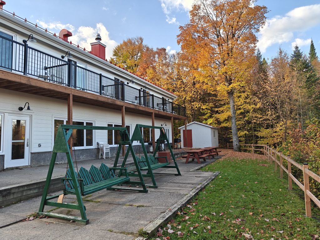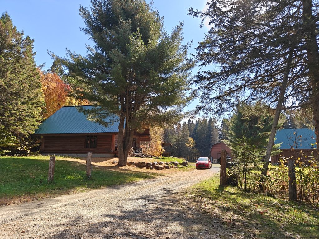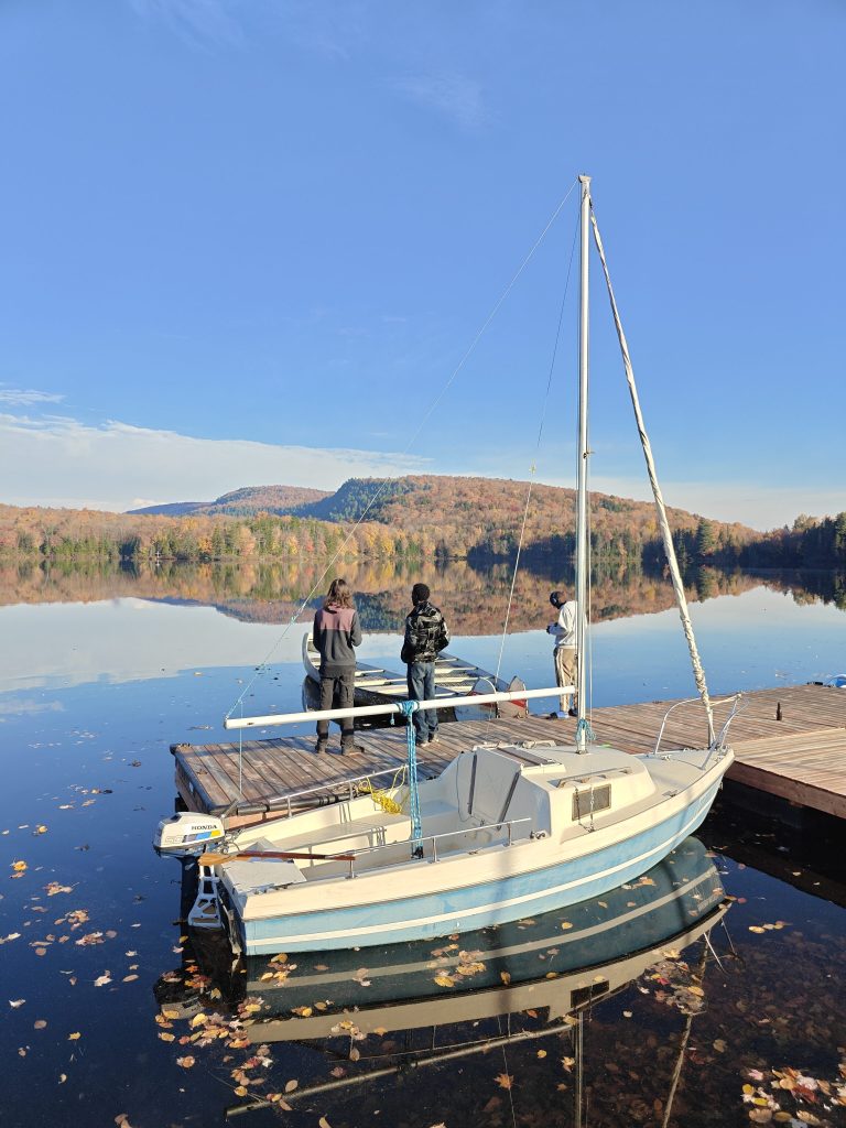 Je découvre des maisons blanches aux toits rouges, couleurs typiques des érablières. Le sol est recouvert de feuilles fraîchement tombées et légèrement luisantes sous la rosée. Je descends vers le lac où je découvre une eau calme reflétant tel un miroir la forêt au-delà.