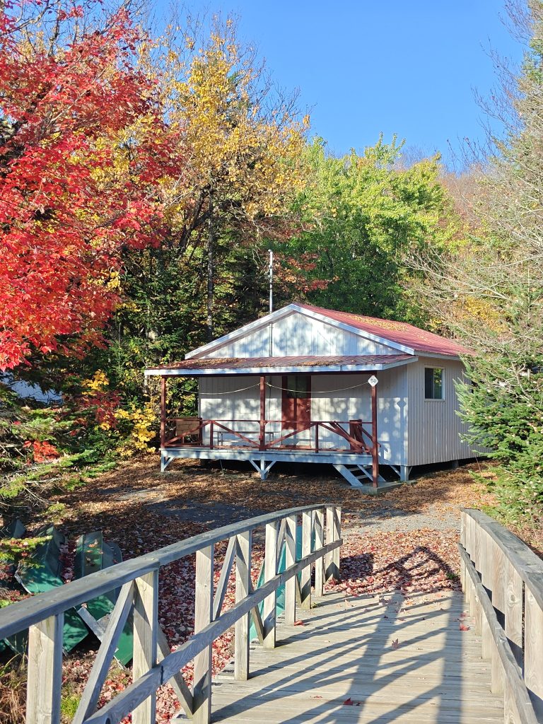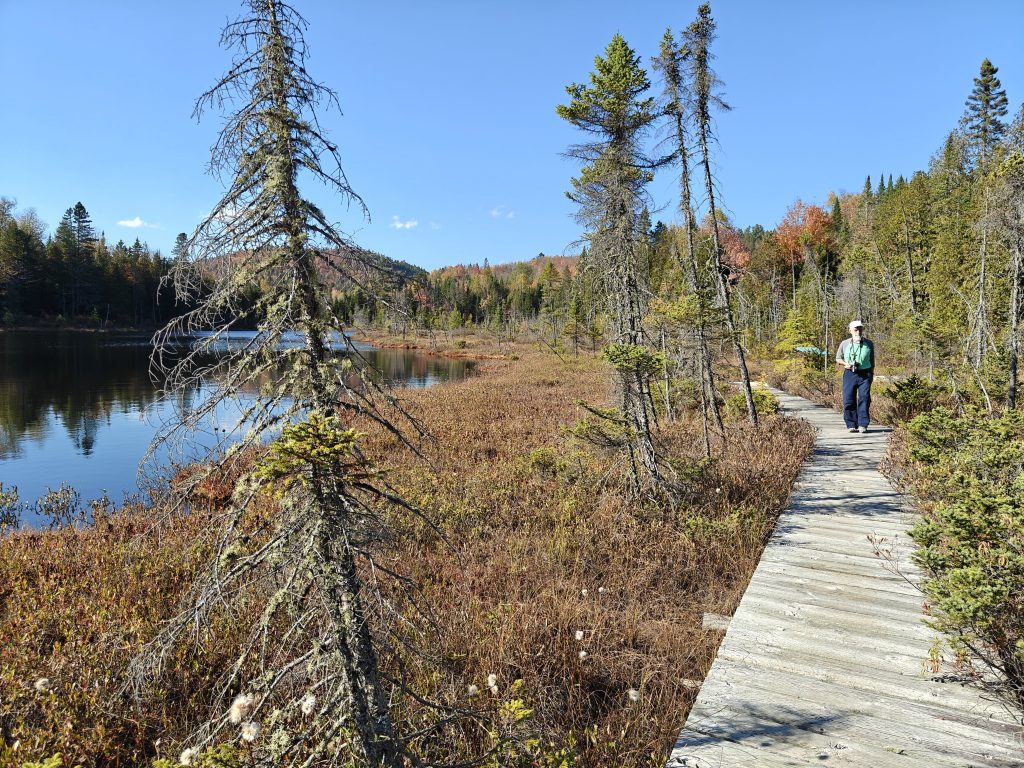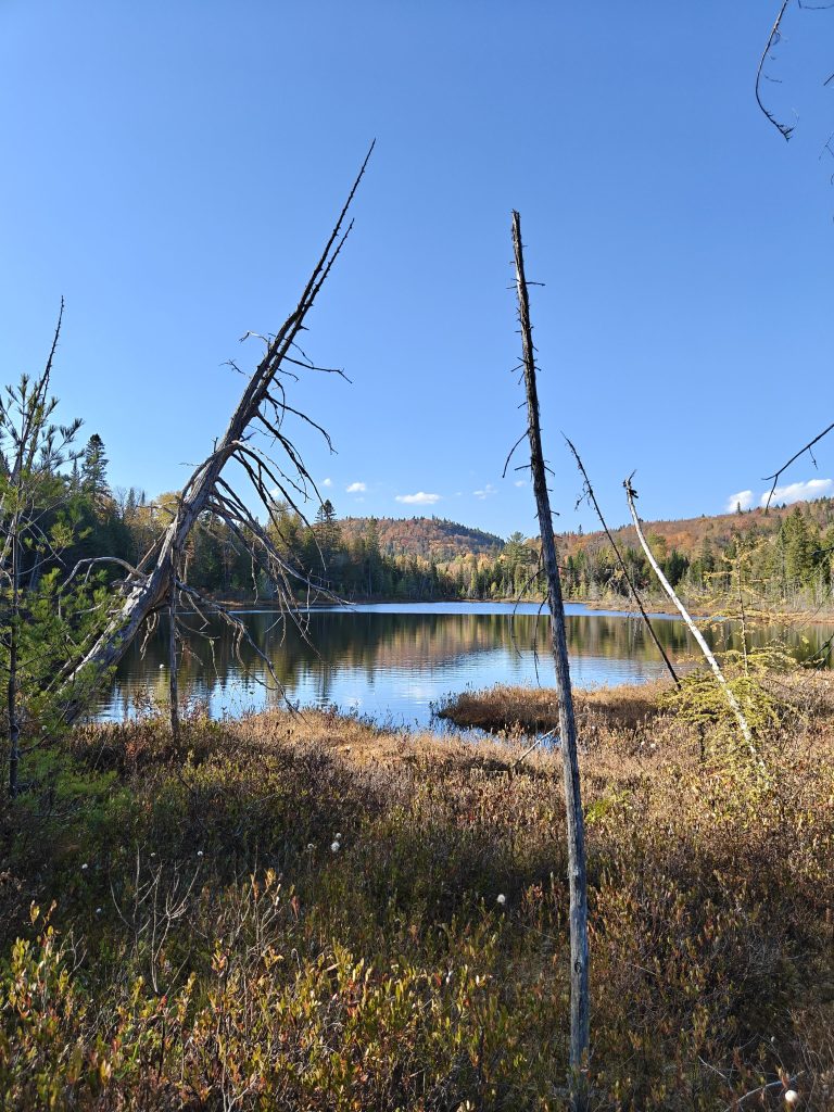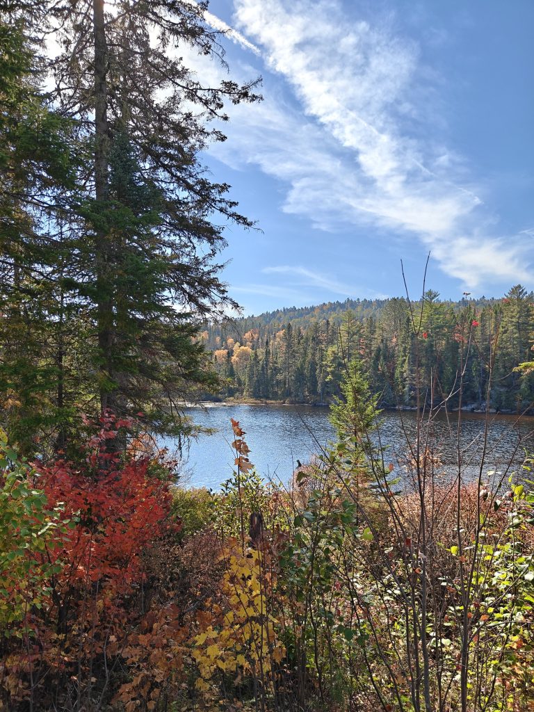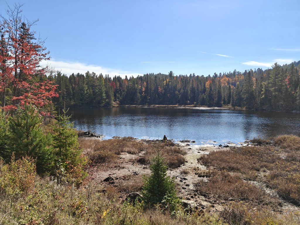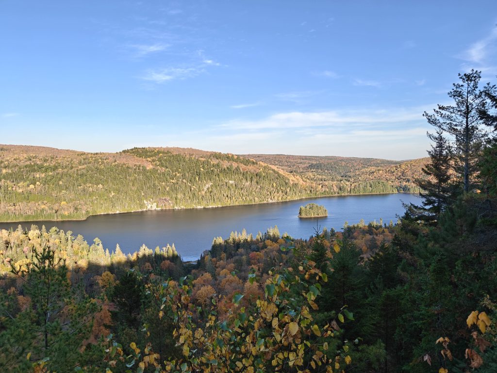 On arrive enfin à notre destination : le Parc Naturel de la Mauricie. Situé dans le bouclier canadien, au nord des basses terres du Saint Laurent, les paysages sont vallonnés et lacustres. Le contraste entre le bleu du ciel et la palette de couleurs de la forêt est le plus beau que j’ai vu. Le ciel est dégagé et le soleil réchauffe les cœurs, et les corps. Je suis habillé bien trop chaud pour la météo. Mais mon petit doigt m’a dit que ca ne durerait pas.