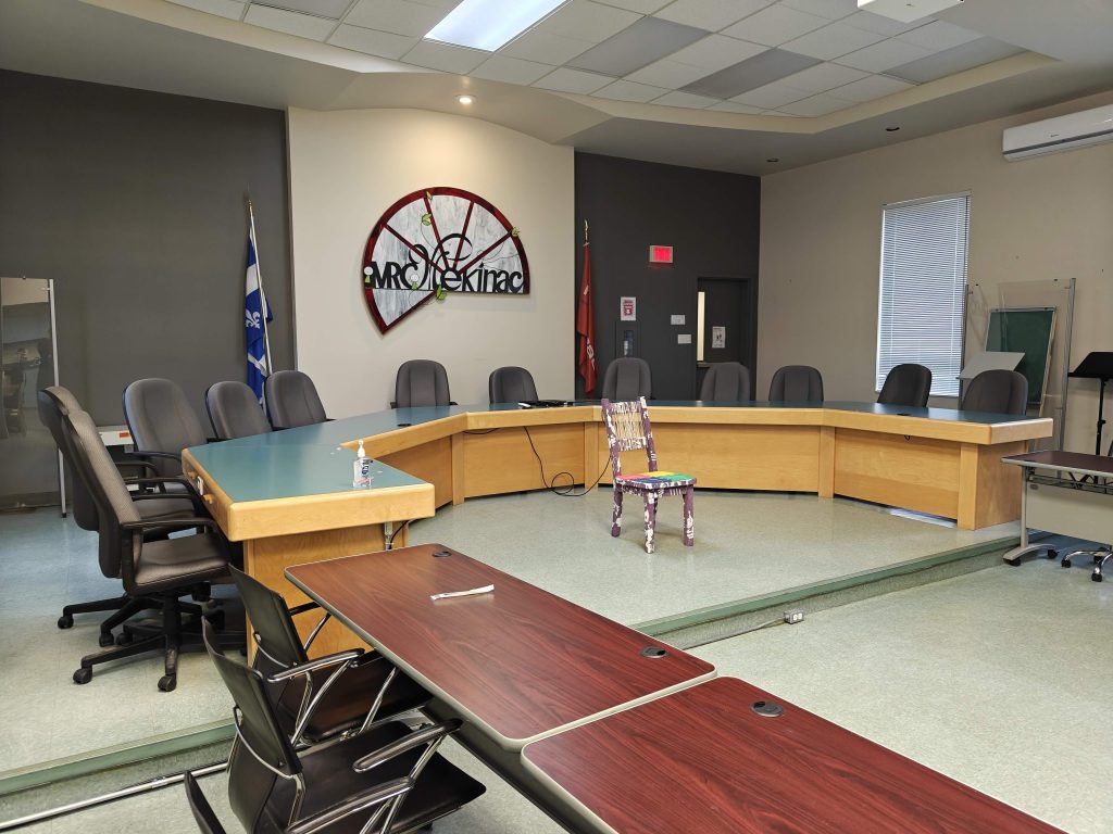 Bien entendu, ce n’est pas pour ça qu’on est là. On affronte la pluie pour venir rencontrer les élus de la MRC de Mékinac. Je vous passe les détails… Ils consistent en des questions administratives de gestion du territoire qui, bien qu’intéressantes pour un étudiant de géo, endormiraient n’importe qui. Notons la présence d’une chaise colorée au milieu de la pièce.