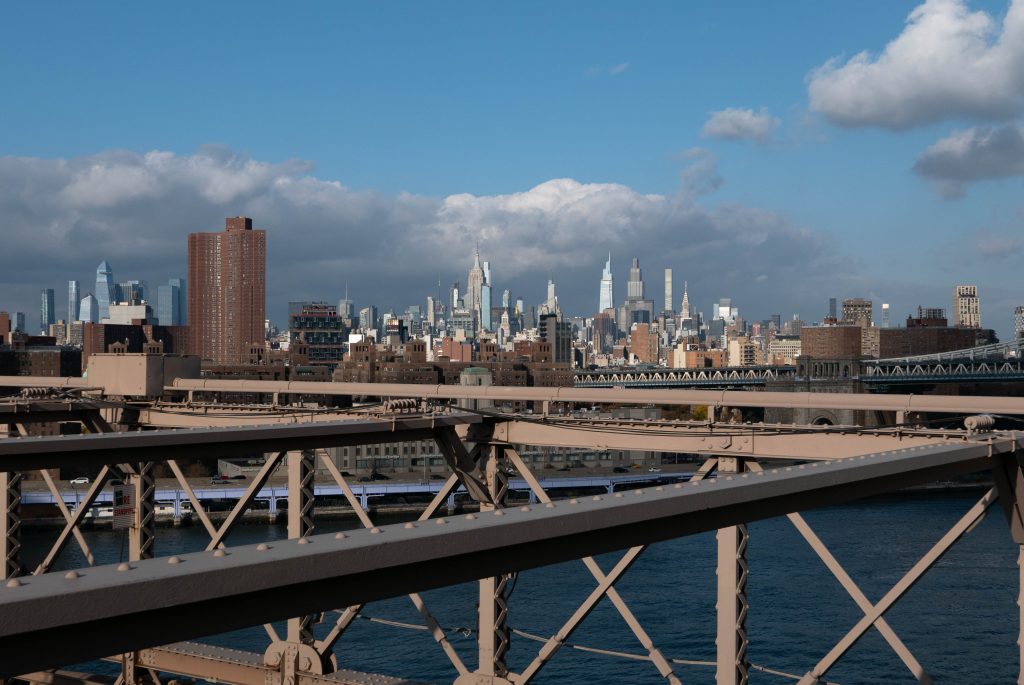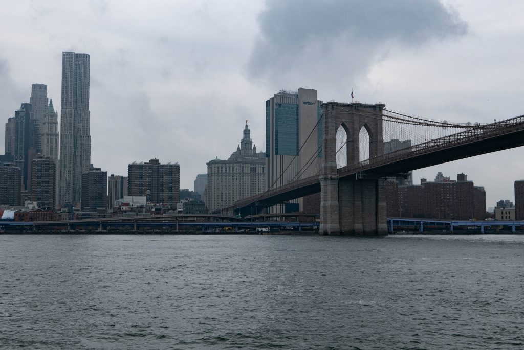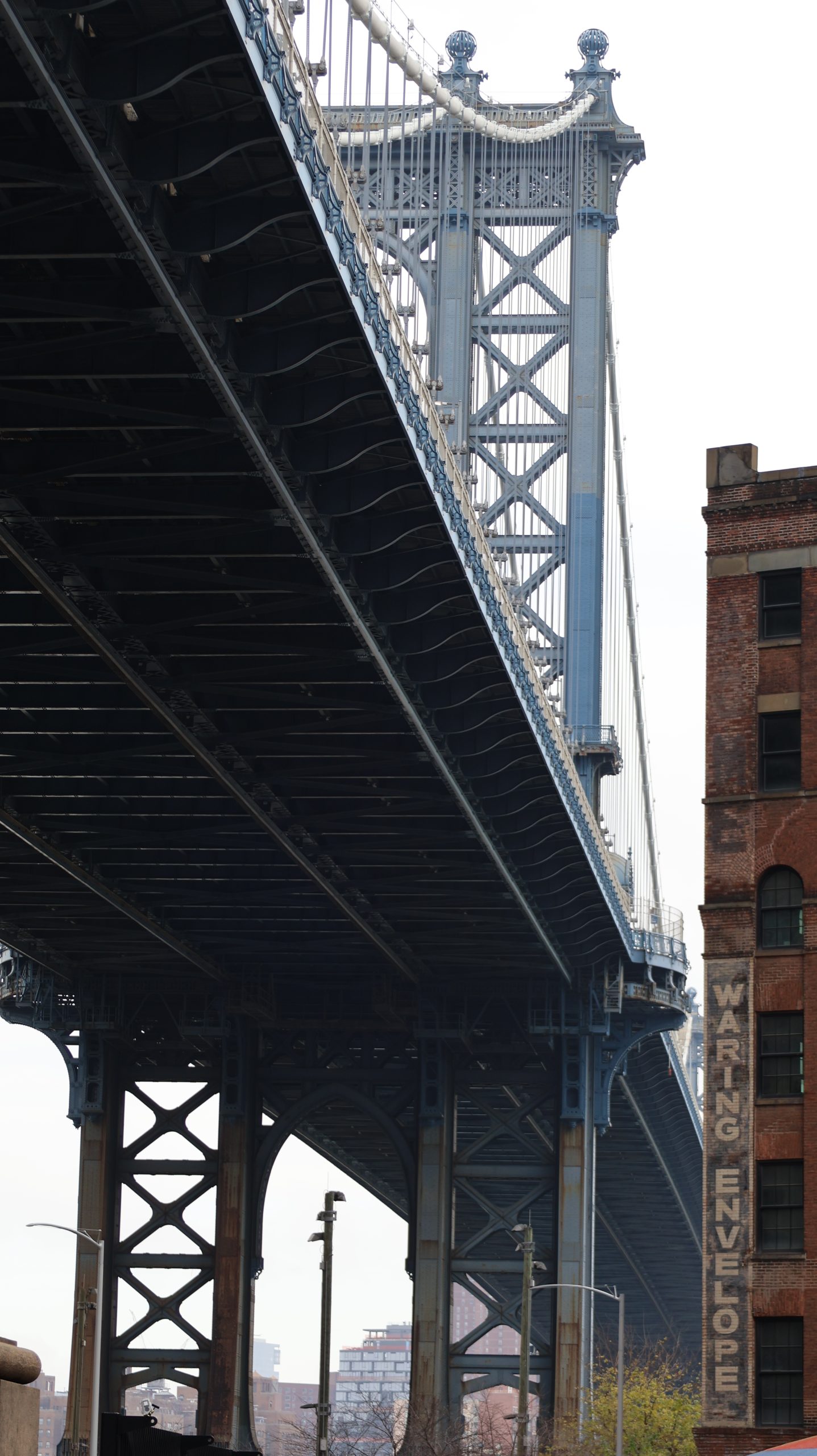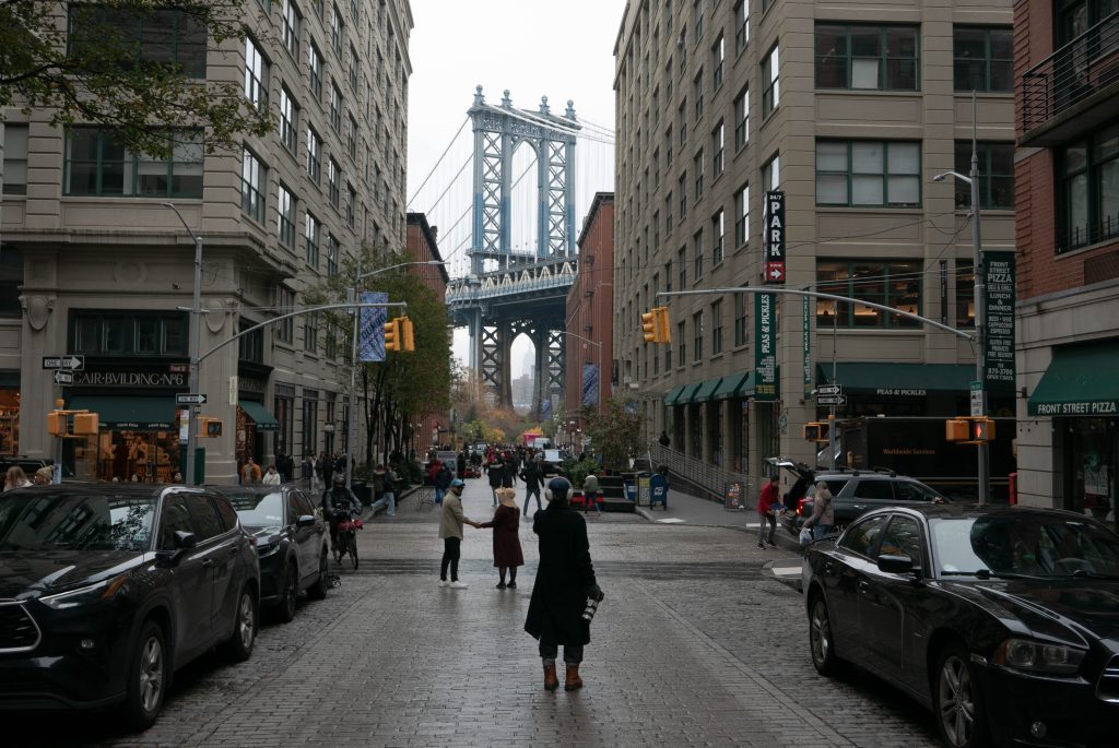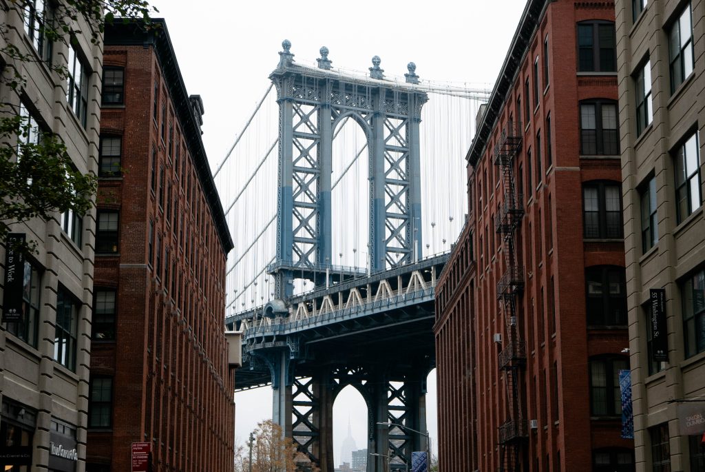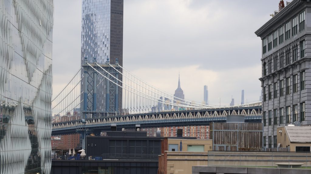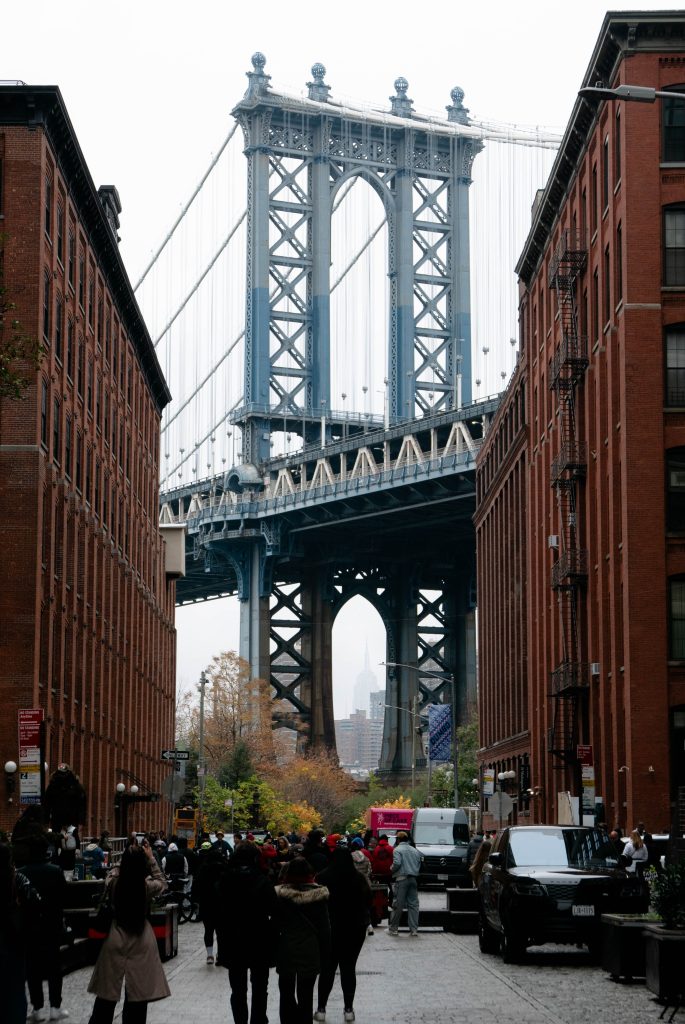 Même un jour pareil, la rue est pleine de gens le regard en l’air. C’est vrai que l’endroit est particulièrement photogénique. Les bâtiments rouges cadrent parfaitement l’arche bleue du pont, qui elle-même laisse apparaitre l’Empire State Building entre ses poutres de métal. Prémonitoire ?