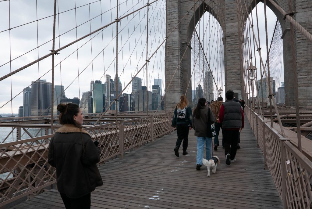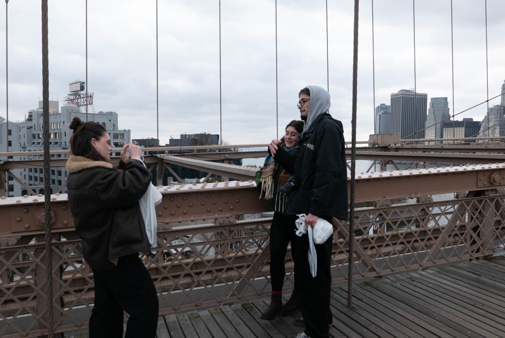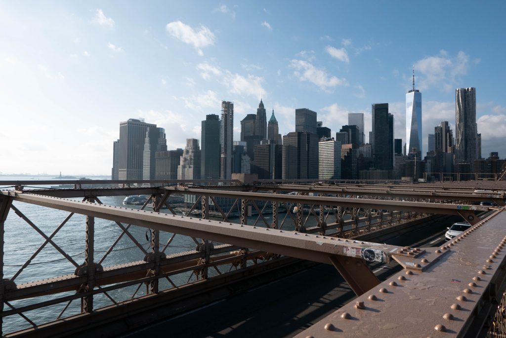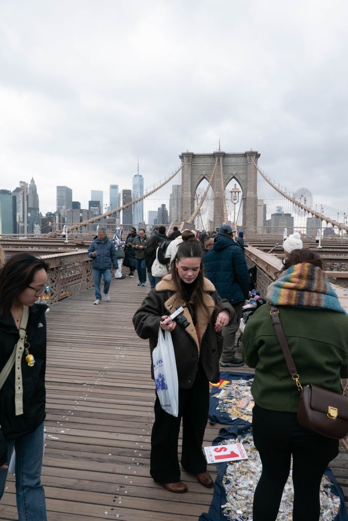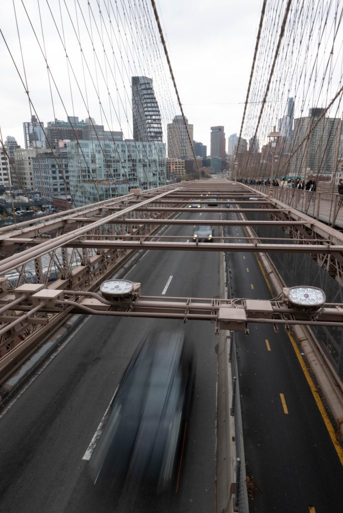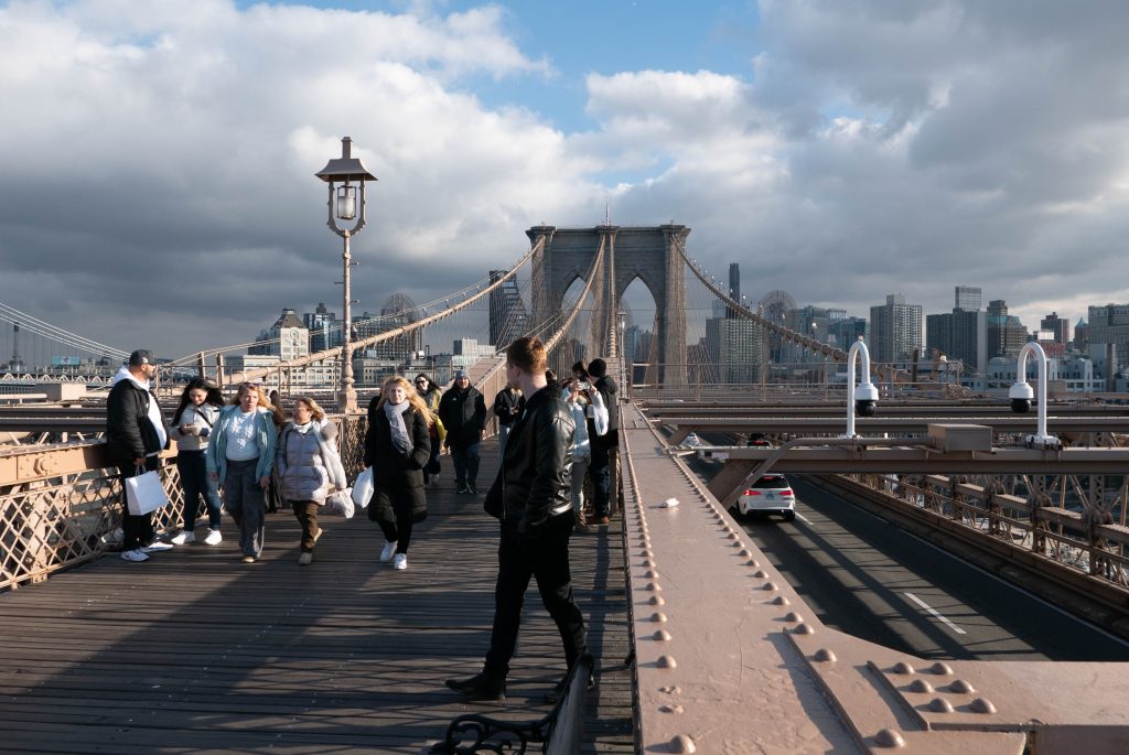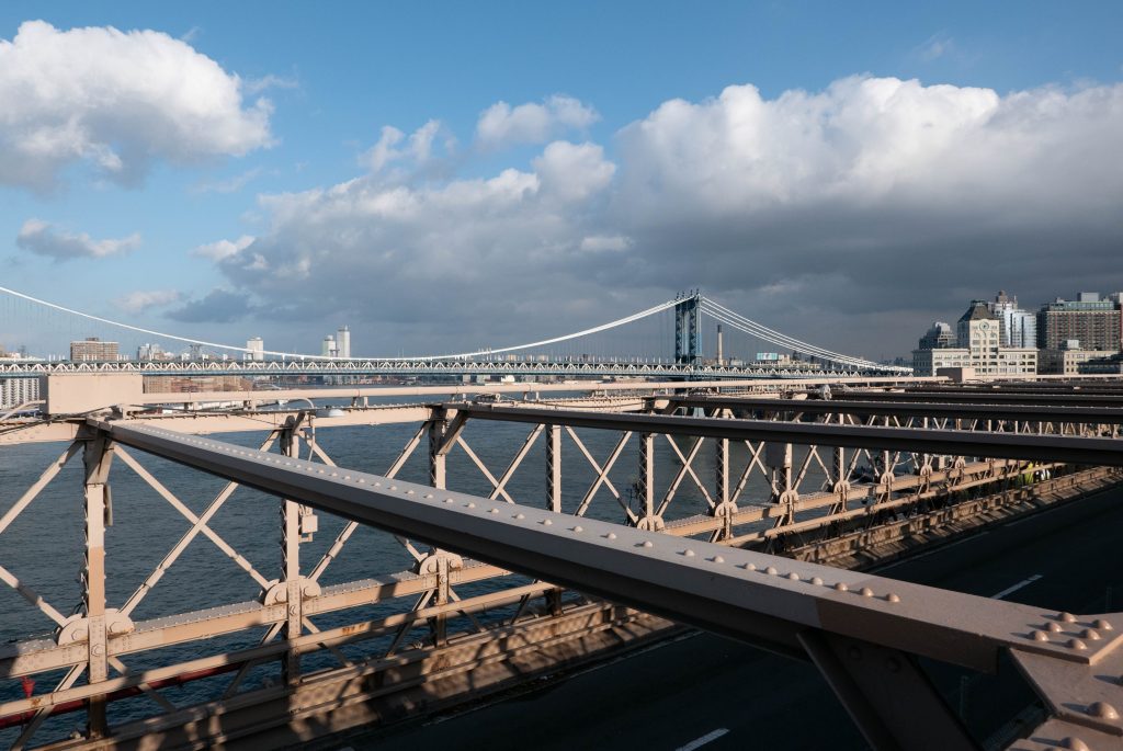 Même un jour pareil, la rue est pleine de gens le regard en l’air. C’est vrai que l’endroit est particulièrement photogénique. Les bâtiments rouges cadrent parfaitement l’arche bleue du pont, qui elle-même laisse apparaitre l’Empire State Building entre ses poutres de métal. Prémonitoire ?