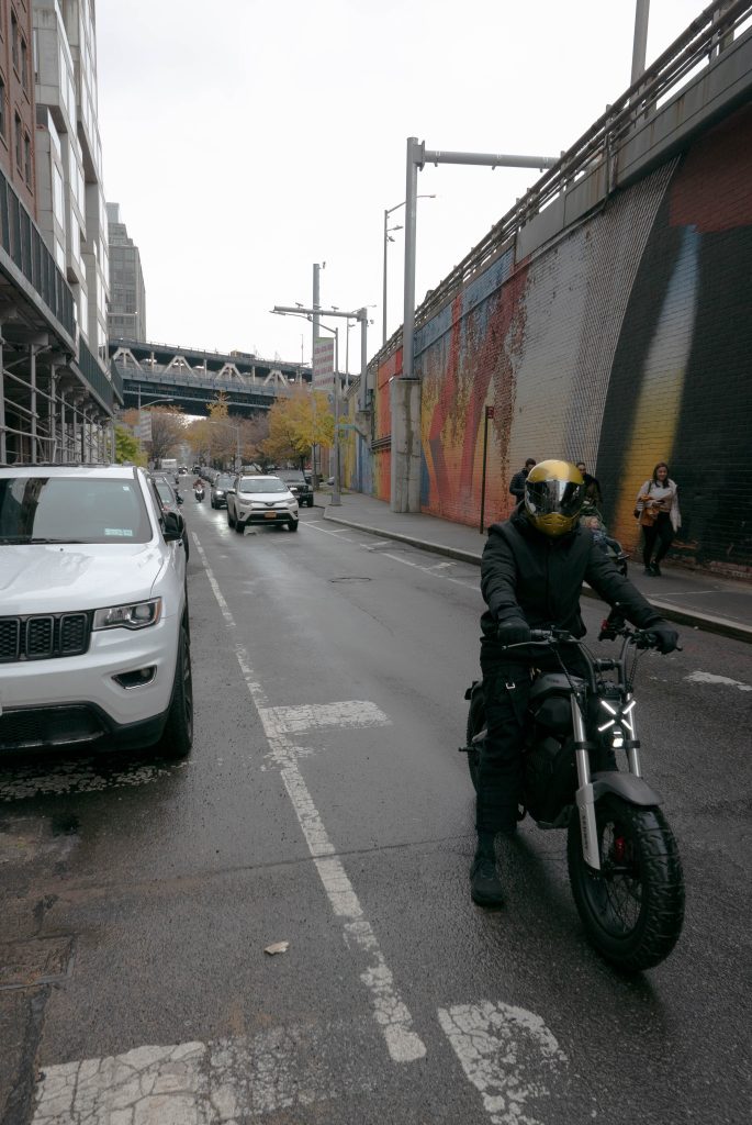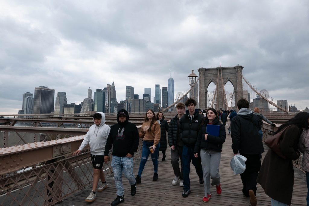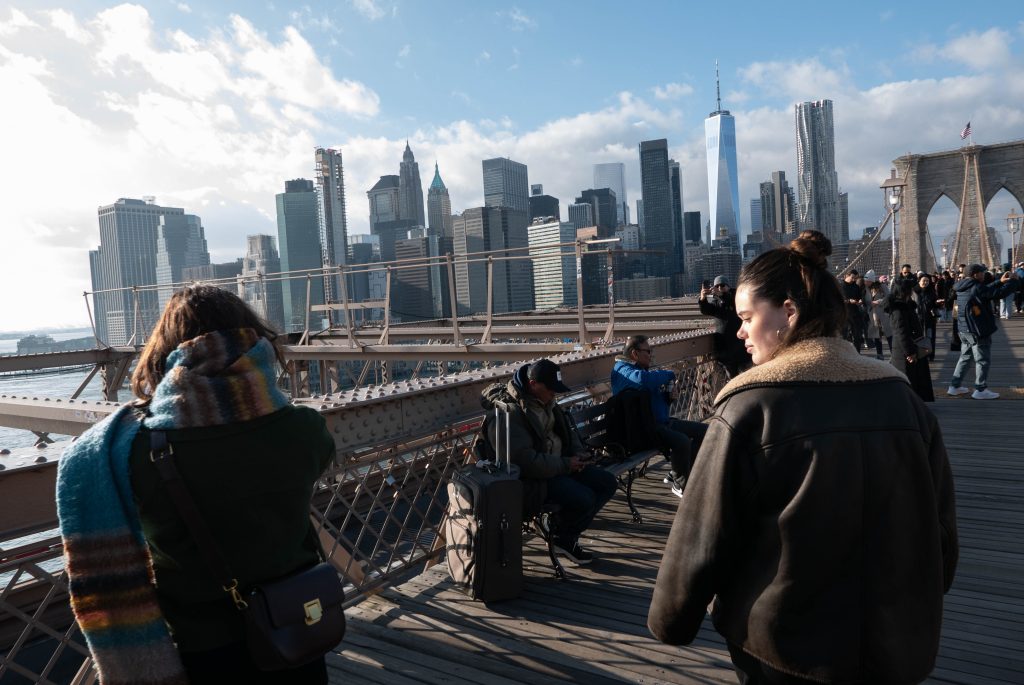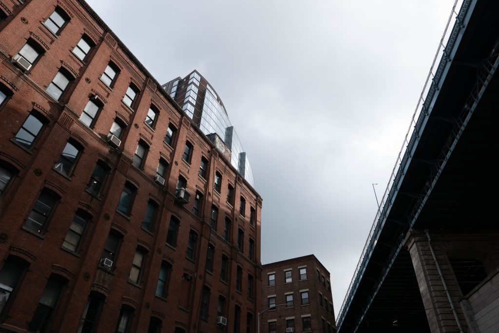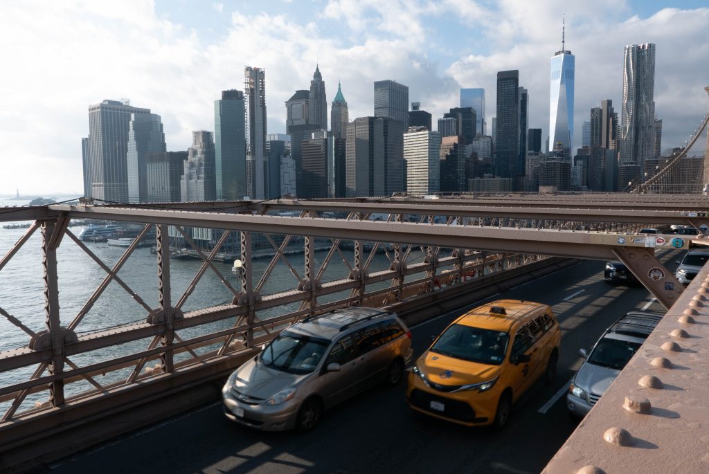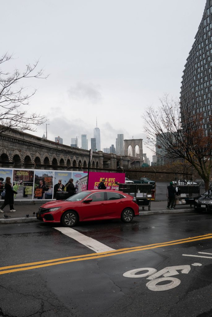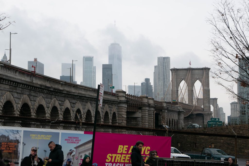 Même un jour pareil, la rue est pleine de gens le regard en l’air. C’est vrai que l’endroit est particulièrement photogénique. Les bâtiments rouges cadrent parfaitement l’arche bleue du pont, qui elle-même laisse apparaitre l’Empire State Building entre ses poutres de métal. Prémonitoire ?