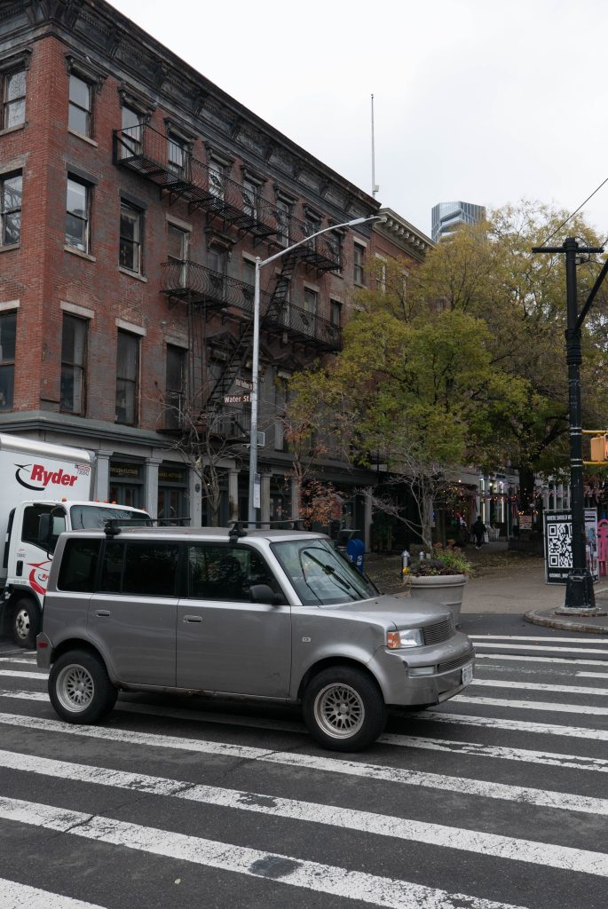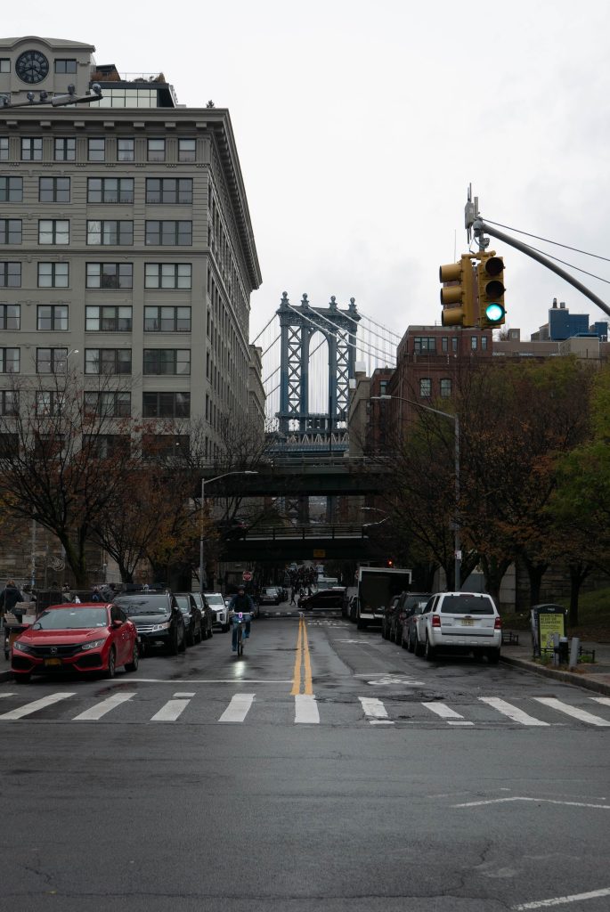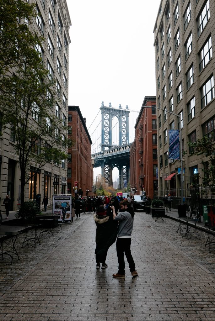 Le temps est gris mais j’ai évité la pluie. Je me retrouve pris en étau entre les ponts de Brooklyn et Manhattan. Je marche dans les rues sans itinéraire, et me retrouve nez à nez avec cette scène. Sans m’en rendre compte, je suis arrivé dans la mythique rue où sont prises tant de photos.