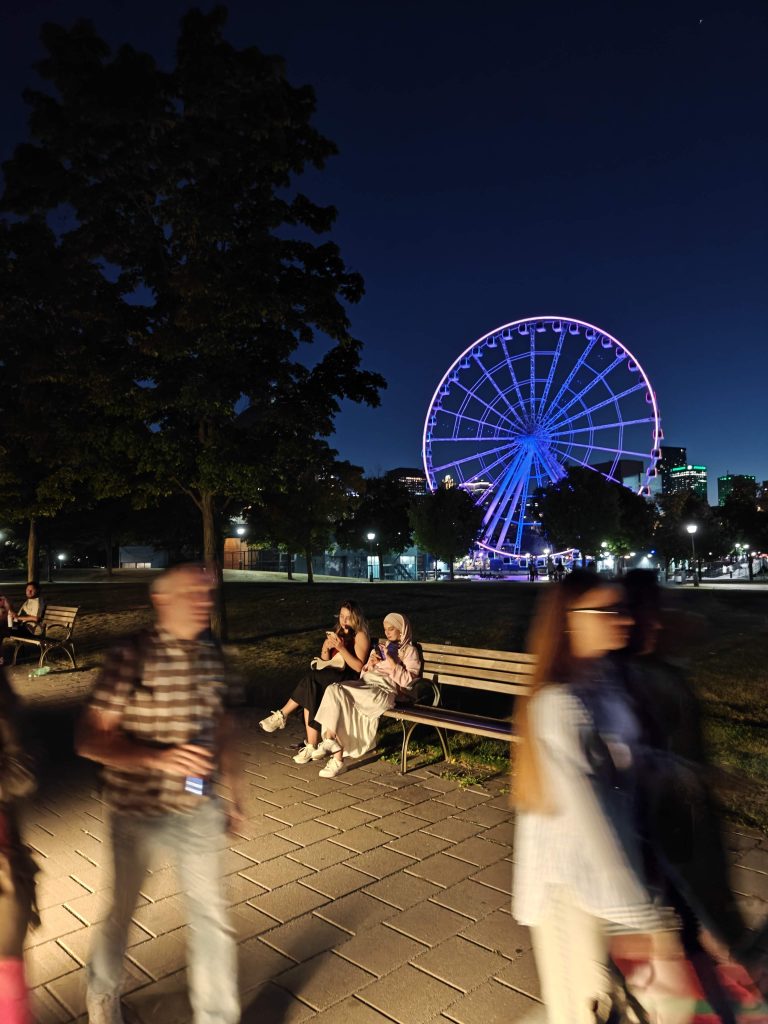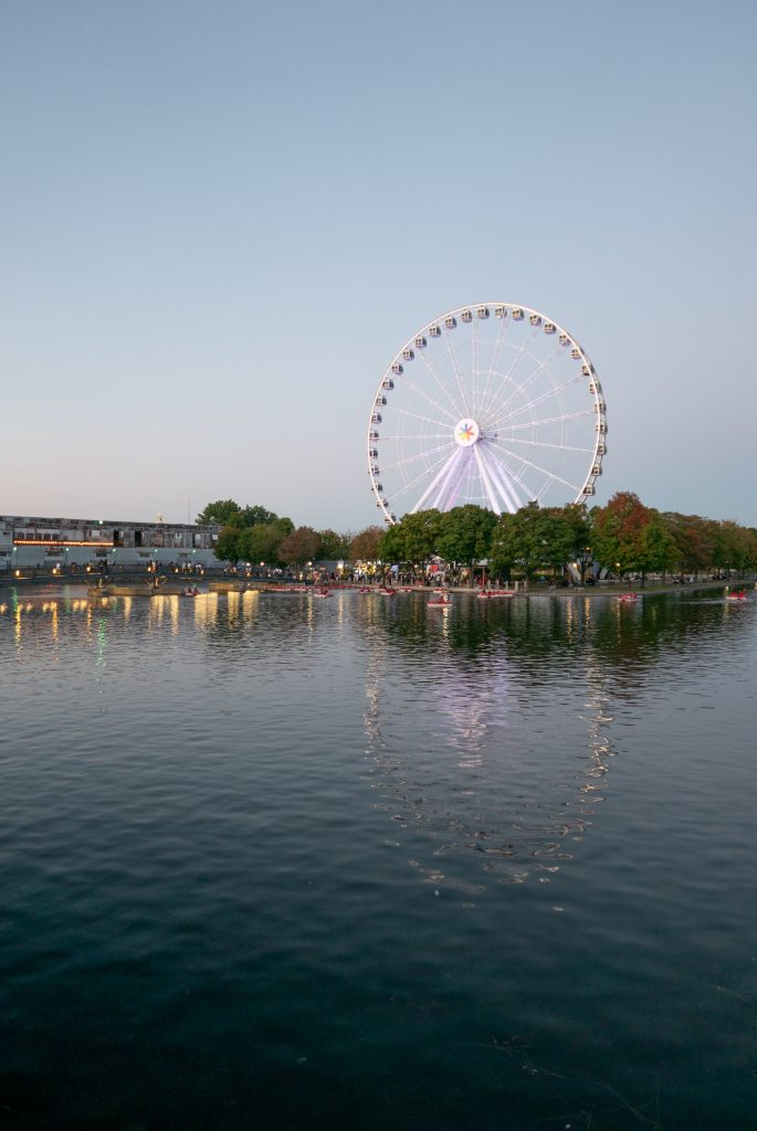 Mes pas me mènent au Vieux Port, situé juste derrière le marché Bonsecours. Les foodtrucks et stands de souvenirs attirent les foules tandis que j’avance en direction de la balustrade du quai. C’est là que je tombe nez à nez avec la grande roue du Vieux Port, et que deux familles de touristes me demandent de prendre des photos d’eux. Au moins ils étaient sympas.