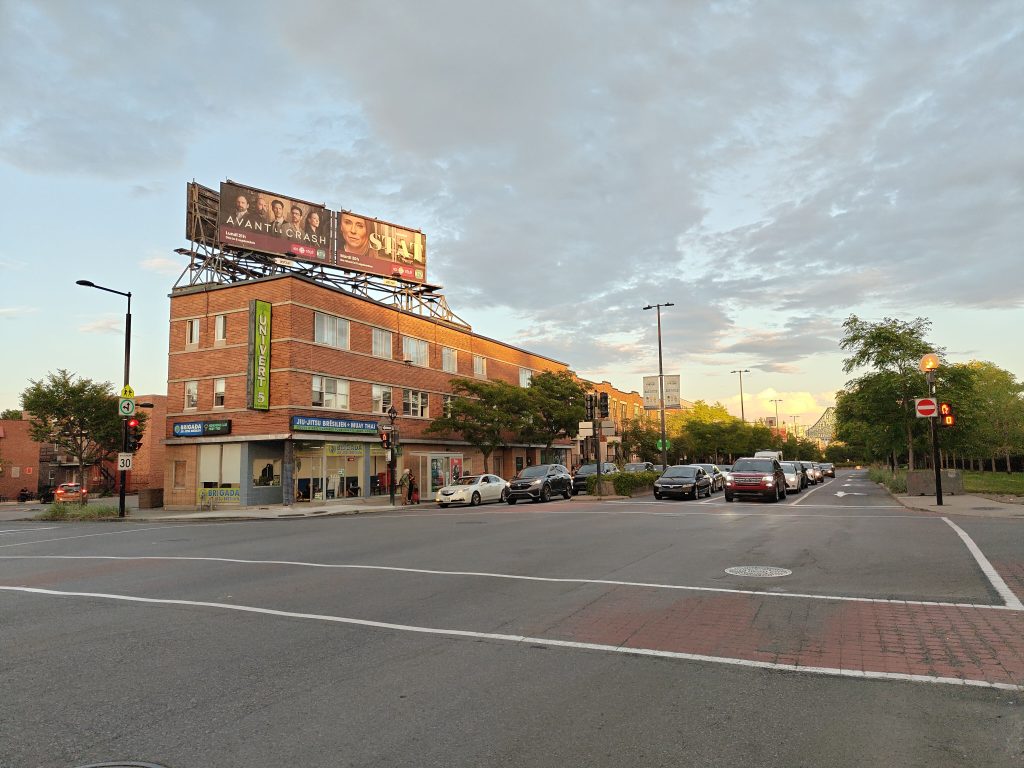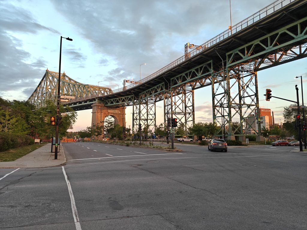 Les rayons dorés du soleil couchant se reflètent sur les briques des bâtiments alors que je longe la rue Ontario Est jusqu’aux faubourgs dans une ambiance de soir d’été. A cette heure là, tout est beau, alors je profite du paysage urbain et prend bien trop de photos et de vidéos pour une seule soirée. Je vois au loin le pont Jacques Cartier, célèbre pont routier reliant Longueuil à Montréal en passant par dessus le Saint Laurent. Je décide d’aller y jeter un coup d’œil. Après tout, rien ne presse.