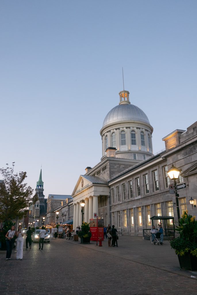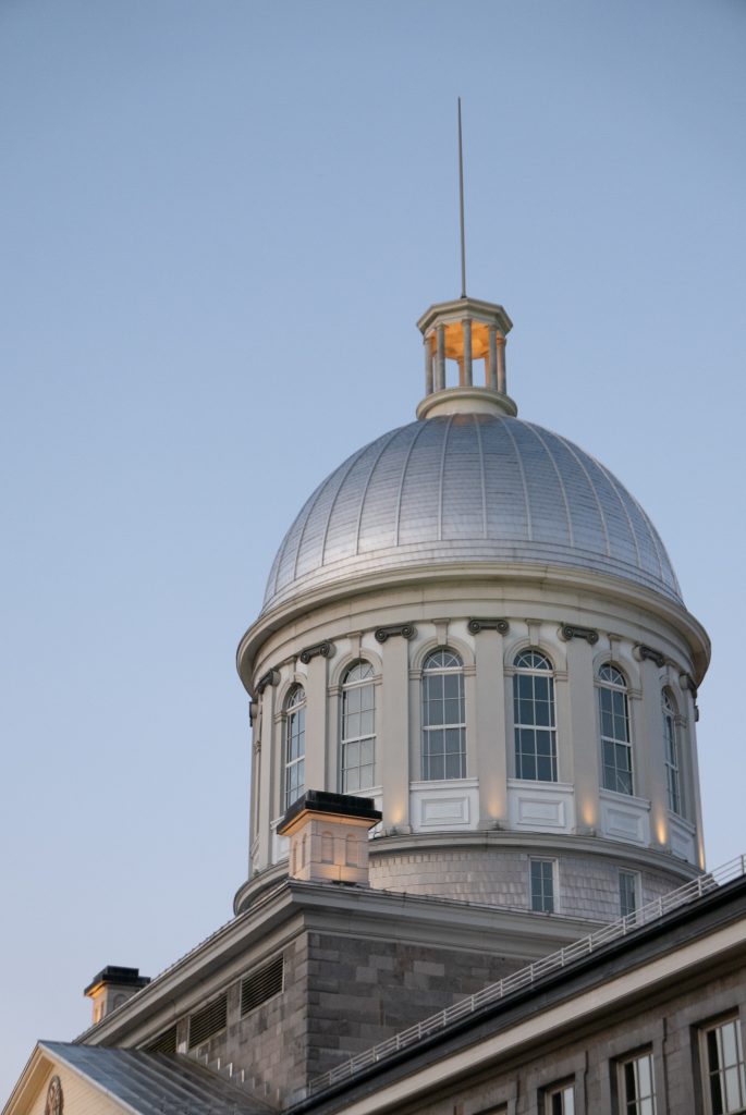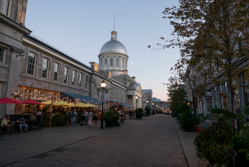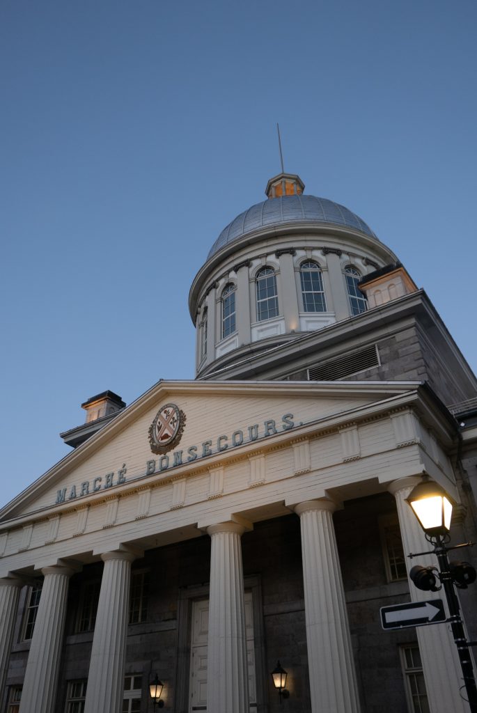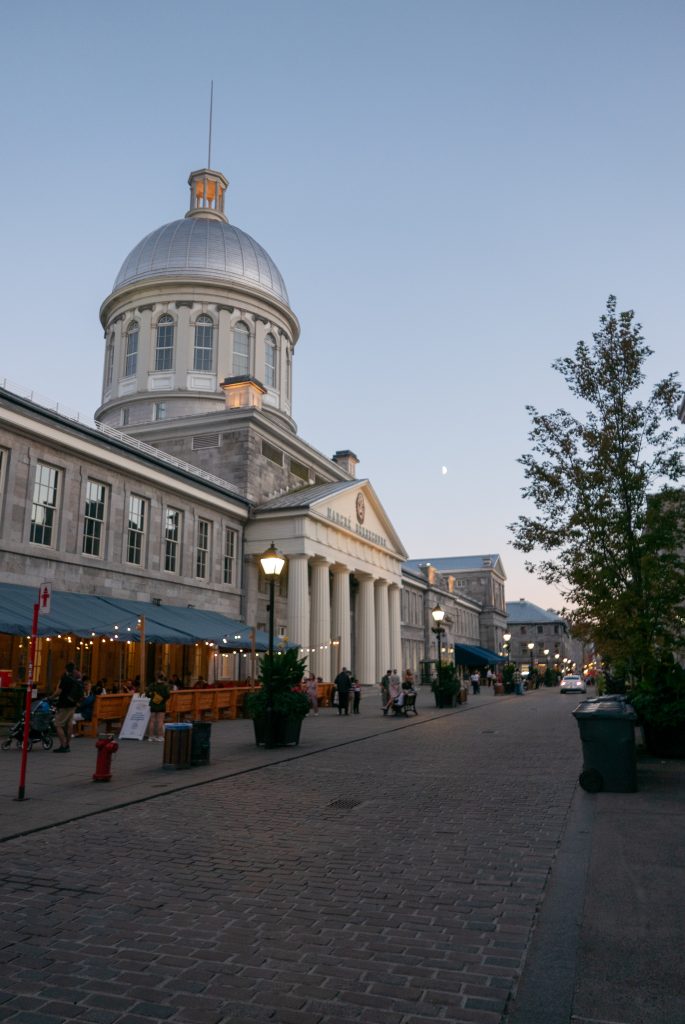 J’aperçois les rues pavées du Vieux Montréal après une vingtaine de minutes de marche. Le premier bâtiment que je croise est le célèbre marché Bonsecours. Il abrite une quinzaine de magasins de vêtements « made in Québec » bien trop chers pour le commun des mortels. Des bars et boutiques attrape touristes occupent les larges trottoirs de la rue. Outre le fait que je me trouve de tout évidence dans un quartier très touristique, l’architecture est magnifique et le coucher du soleil apporte une luminosité et une douceur parfaite pour une marche du soir.