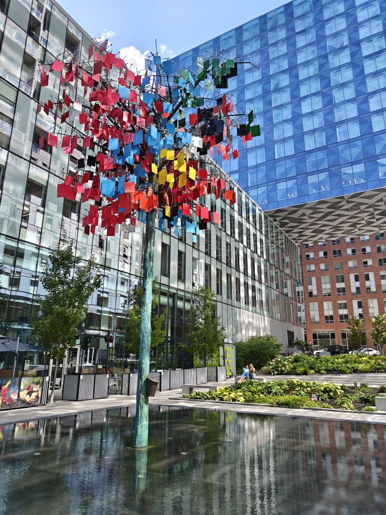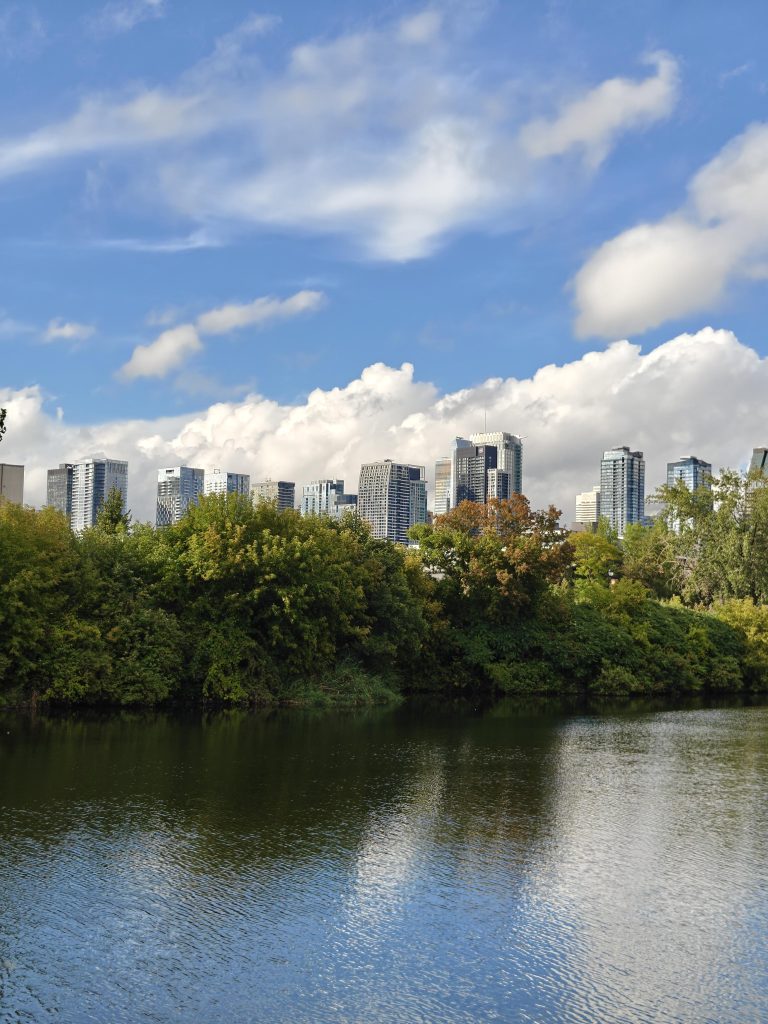 Après avoir passé plusieurs heures à parler de tout et de rien autour d’un thé, nous nous quittons et je rentre en vélo le long du canal Lachine sous un beau soleil de fin d’après midi. La vue est dégagée et je peux voir au loin une rangée d’immeubles contrastant avec le vert de la végétation luxuriante.