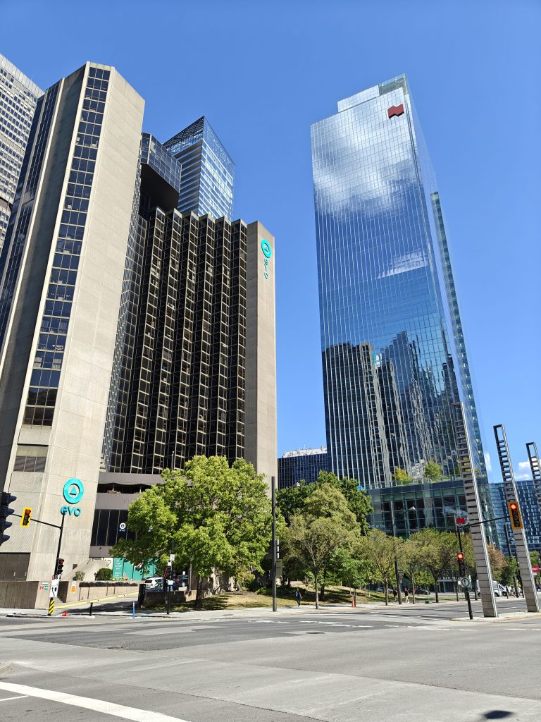A peine le repas avec Clotilde et son gars prend fin que le vendeur me donne rendez vous au centre ville de Montréal, en périphérie des grattes ciels et des tours de verre. Je crève de chaud au soleil mais la dimension de tout ce qui m’entoure m’émerveille juste assez pour que j’oublie la notion du temps et que les trois quart d’heure de trajet se transforment en quelques minutes ressenties.
