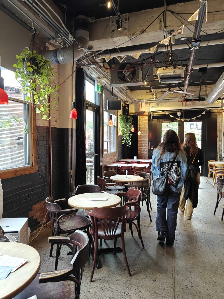 Le bâtiment 7 est une grande barre en brique rouge entourée de passerelles en bois. On découvre une fois arrivée que la libraire en question n’est pas ouverte, et que nous sommes manifestement les seuls a avoir vu qu’elle était sensé l’être. Fin bref, on déambules, on regarde les ateliers animés depuis les couloirs et faisons un tour au bar sans pour autant s’arrêter pour boire un coup.