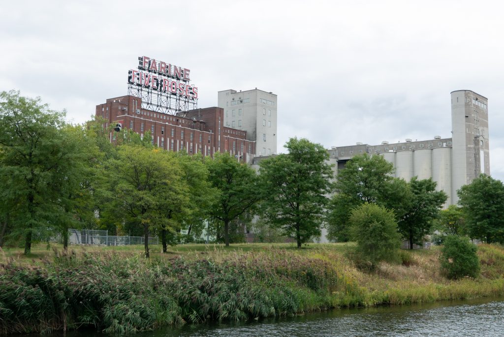 Clotilde à proposé aux étudiants de l’association de géographie de se retrouver pour faire des rencontres et découvrir la ville. Maëlle a répondu à l’appel et nous a proposé de se retrouver au bâtiment 7, un centre communautaire accueillant ateliers et associations. Le trajet en vélo, certes effectué sous la pluie, m’a permis de passer par le Vieux Montréal, le Vieux Port et quelques zones industrielles abandonnées de la rive du Saint Laurent, ainsi que l’affichage du mythique Farine Five Roses.